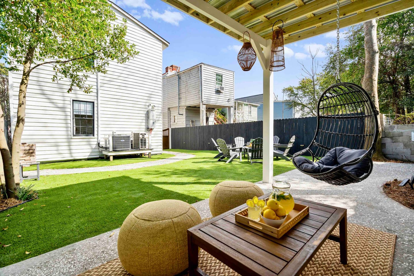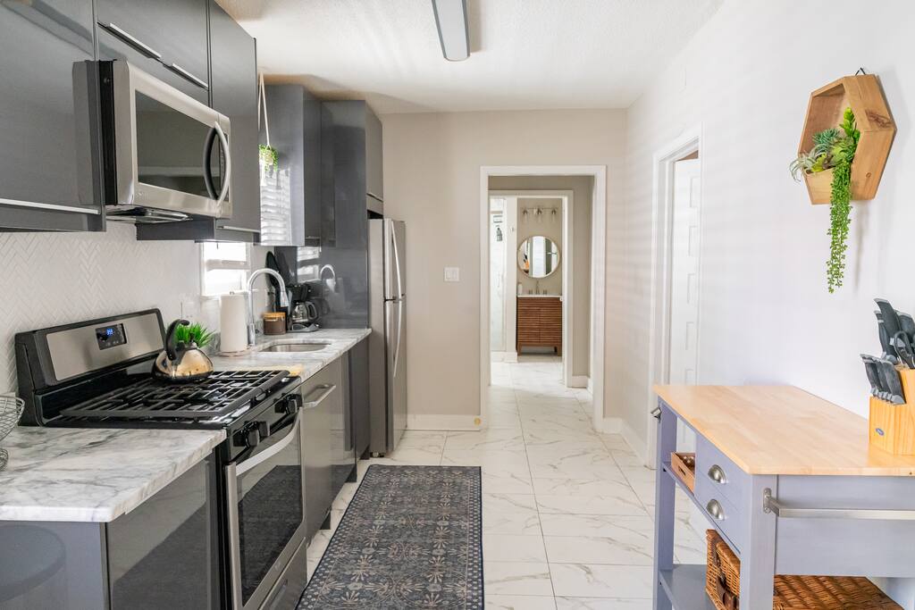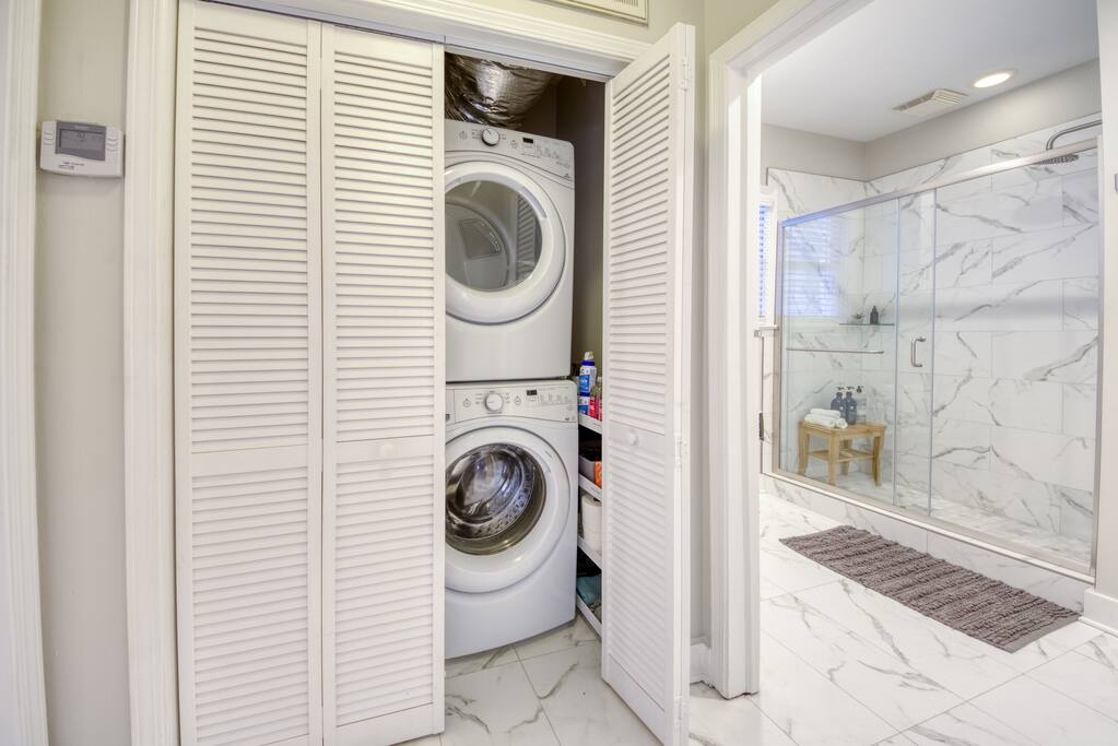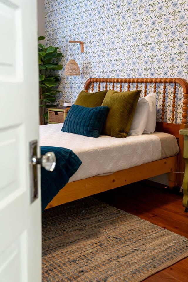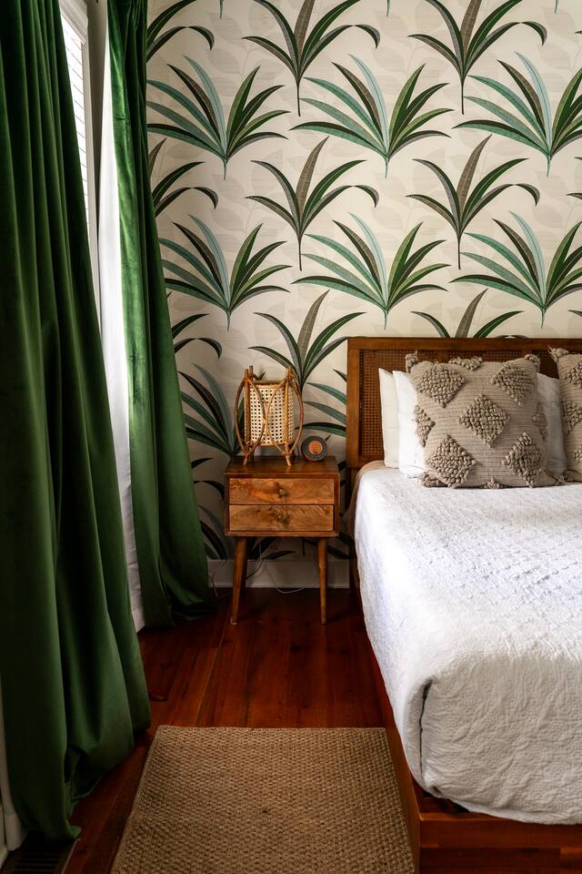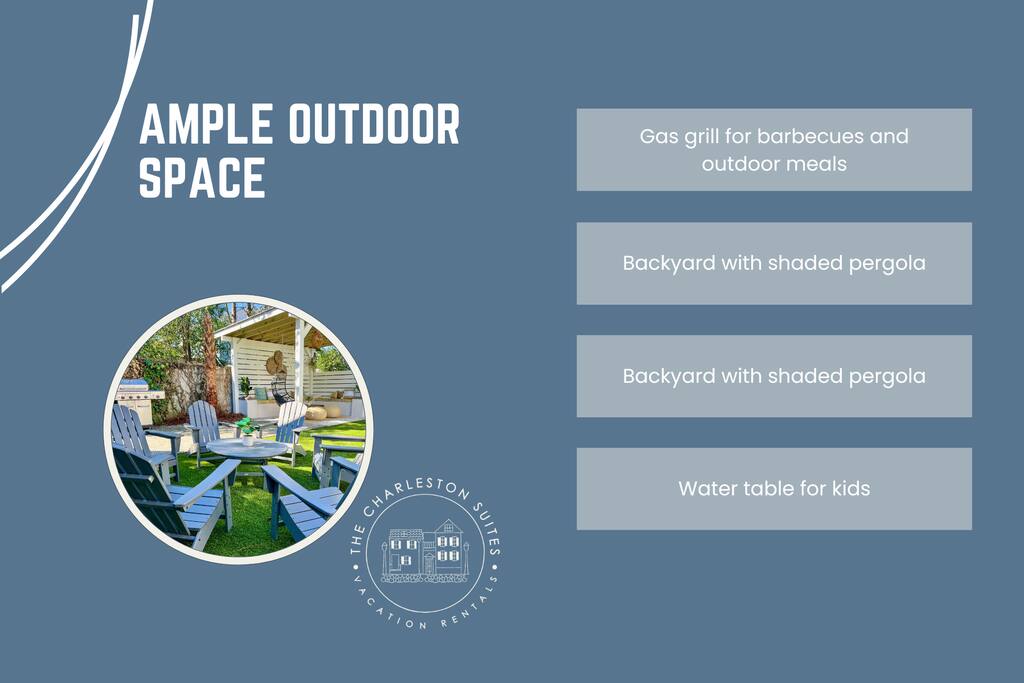 Step into your private first-floor unit, where the living room welcomes you with the vibrant colors of Charleston. Woven window shades filter in soft natural light while keeping things cozy and private. Feel like cooking? The eat-in kitchen blends modern flair with comfort. With sleek grey cabinets, a chic white herringbone backsplash, and stainless-steel appliances, it’s the perfect spot to whip up a meal. The Charles Suite offers two bedrooms, each with its own stunning wallpaper. The first bedroom features a plush queen-size bed, a closet, dresser, and desk for any work you need to tackle. Bedside lamps make late-night reading a breeze. The second bedroom boasts a queen bed with a luxurious TempurPedic mattress, a dresser, a closet, and wall sconces. The bathroom is complete with a stand-up rain shower. Just outside, beyond the neighboring duplex (we own both!), you’ll find a shared backyard that’s pure bliss. Relax under the custom pergola with built-in benches, sway in the swinging chair, kick back in Adirondack chairs, or play a round of giant JENGA. Fire up the grill and soak up Charleston’s gorgeous weather. The Charles Suite is packed with thoughtful amenities: high-speed Wi-Fi, air conditioning, heating, and free parking for one car. Families will love the pack + play and highchair, kids’ toys and books, and infant bathtub. Plus, we’ve got beach towels ready for your coastal adventures. Nestled in the heart of the city, you’re steps away from trendy cocktail bars, delicious restaurants, and charming boutique shops. Craving the beach? You are a 20 minute drive from Folly, Sullivan's and IOP. Whether you’re here to explore the city or the beaches, The Charles Suite is your ideal Charleston home base. City of Charleston Certificate of Operation: OP2023-04269