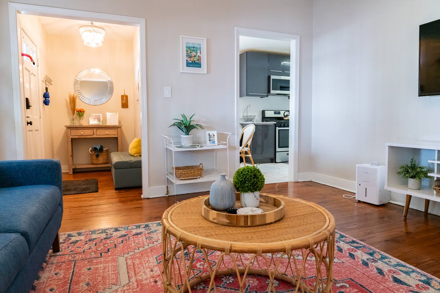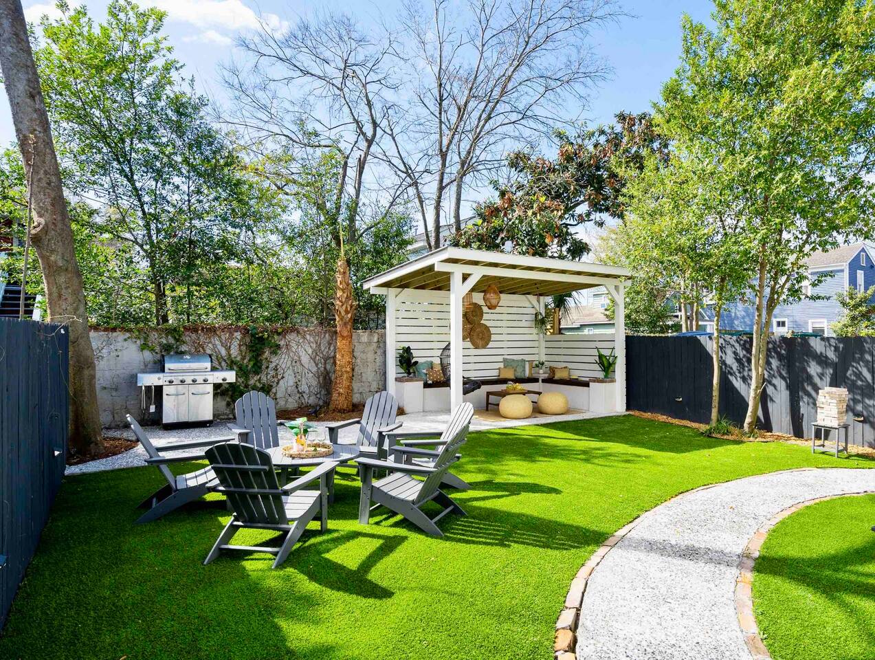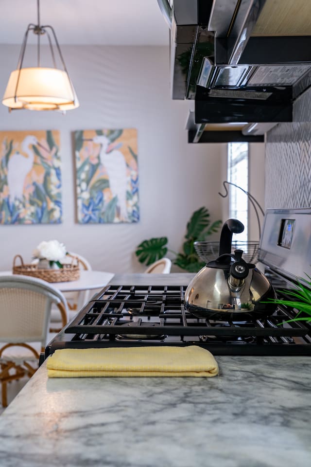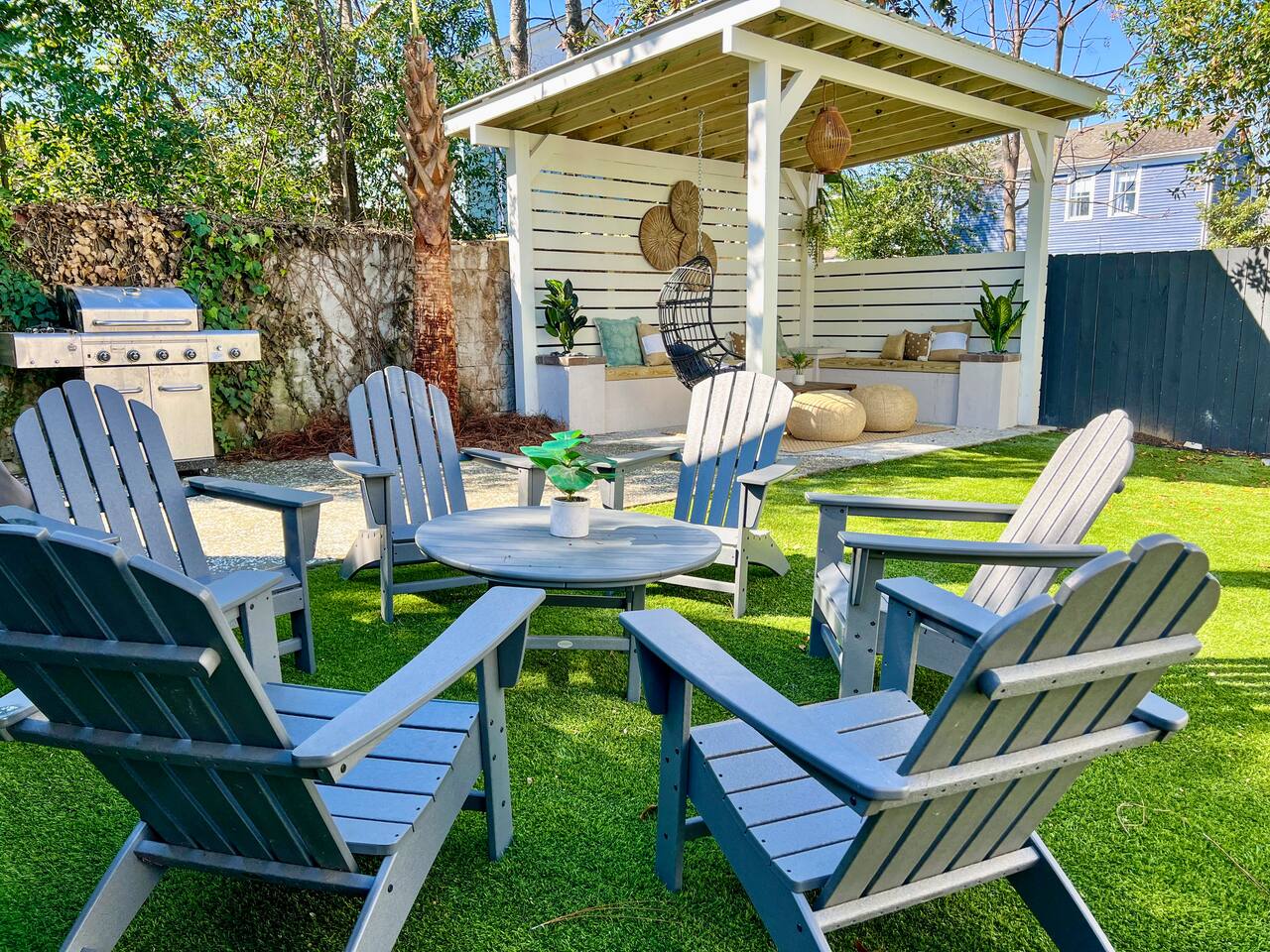 Step into your private first-floor unit, where the living room welcomes you with the vibrant colors of Charleston. Woven window shades filter in soft natural light while keeping things cozy and private. Feel like cooking? The eat-in kitchen blends modern flair with comfort. With sleek grey cabinets, a chic white herringbone backsplash, and stainless-steel appliances, it’s the perfect spot to whip up a meal. The Charles Suite offers two bedrooms, each with its own stunning wallpaper. The first bedroom features a plush queen-size bed, a closet, dresser, and desk for any work you need to tackle. Bedside lamps make late-night reading a breeze. The second bedroom boasts a queen bed with a luxurious TempurPedic mattress, a dresser, a closet, and wall sconces. The bathroom is complete with a stand-up rain shower. Just outside, beyond the neighboring duplex (we own both!), you’ll find a shared backyard that’s pure bliss. Relax under the custom pergola with built-in benches, sway in the swinging chair, kick back in Adirondack chairs, or play a round of giant JENGA. Fire up the grill and soak up Charleston’s gorgeous weather. The Charles Suite is packed with thoughtful amenities: high-speed Wi-Fi, air conditioning, heating, and free parking for one car. Families will love the pack + play and highchair, kids’ toys and books, and infant bathtub. Plus, we’ve got beach towels ready for your coastal adventures. Nestled in the heart of the city, you’re steps away from trendy cocktail bars, delicious restaurants, and charming boutique shops. Craving the beach? You are a 20 minute drive from Folly, Sullivan's and IOP. Whether you’re here to explore the city or the beaches, The Charles Suite is your ideal Charleston home base. City of Charleston Certificate of Operation: OP2023-04269