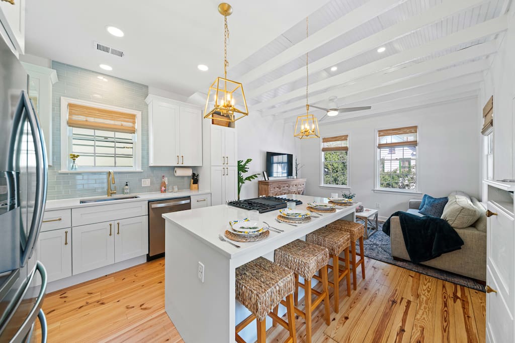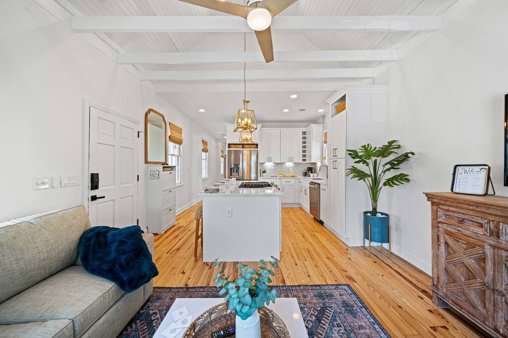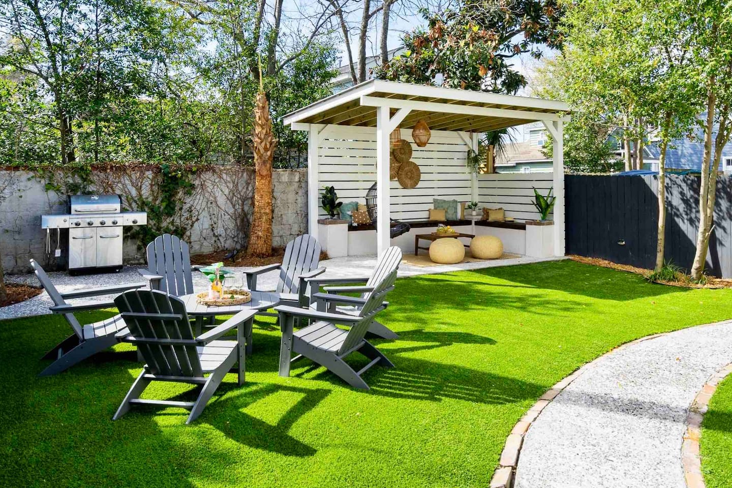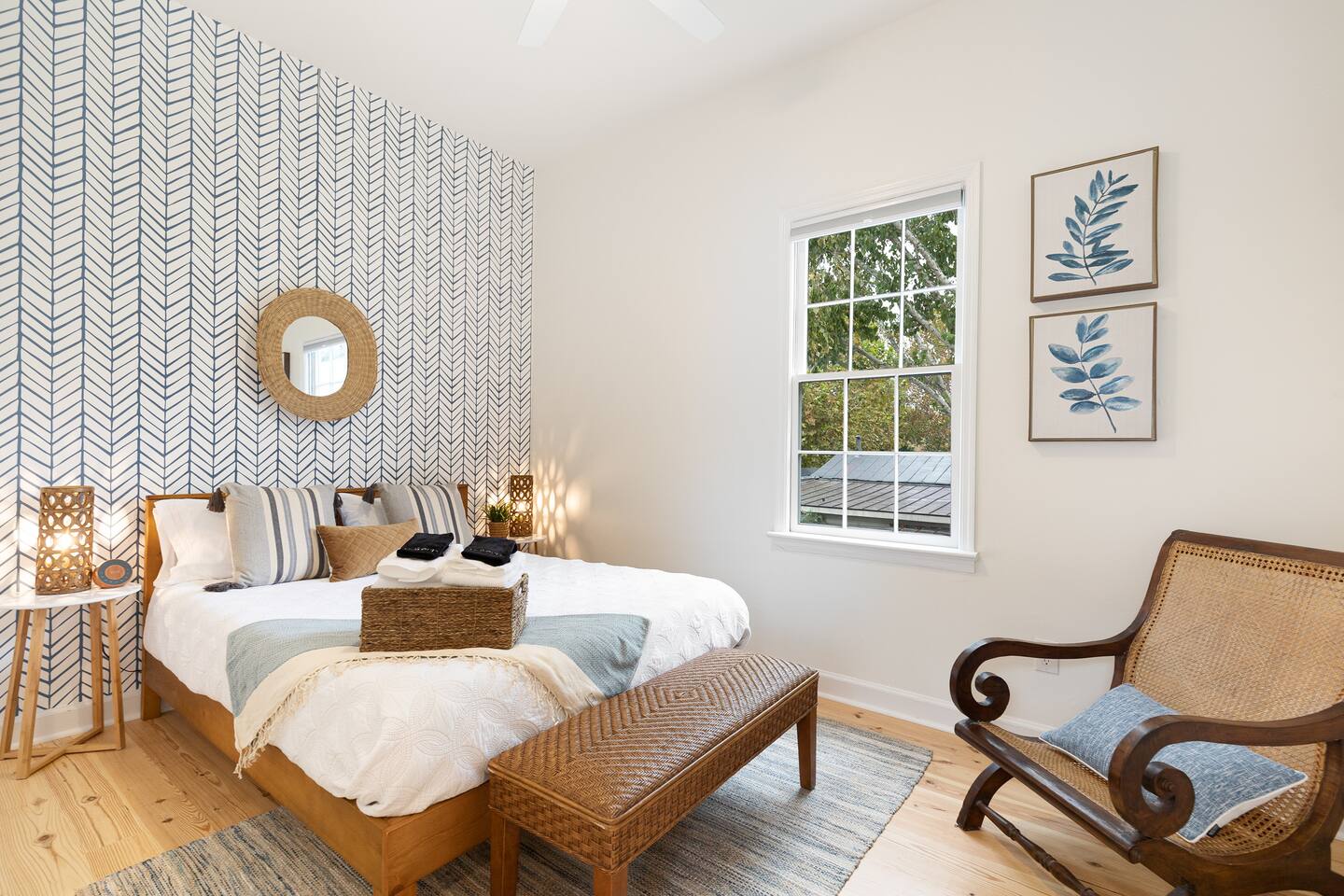 Welcome to The Harper Suite, a newly renovated top-floor retreat in Charleston, blending style and comfort for a memorable coastal getaway. Perfect for families or groups of up to 6, this bright 1200 sq ft space features an open floor plan, vaulted ceilings, a private balcony, and a shared, professionally turfed backyard. The chef’s kitchen boasts quartz countertops, a spacious island, and new appliances, ideal for meals big or small. Unwind in the cozy living room or on the balcony’s porch swing, enjoying the Charleston breeze. Three comfortable bedrooms include a king-bed primary with a desk and walk-in closet, and two queen-bed rooms with coastal-inspired decor, blackout blinds, and sound machines. The bathroom offers a rain shower, bathtub, dual vanity, fresh towels, toiletries, a hairdryer, and a steamer. Outside, the backyard is perfect for grilling or relaxing with a pergola, bench seating, chair swing, poufs, and a JENGA set. Additional amenities include high-speed Wi-Fi, AC, heating, washer/dryer, and free parking for one vehicle. Families will love the pack + play, highchair, toys, books, beach towels, and accessories. Nestled in a quiet neighborhood, The Harper Suite is a short walk from cocktail bars, restaurants, and boutique shops, with three beaches just 15 minutes away. Whether seeking adventure or relaxation, this suite ensures an unforgettable Charleston stay. Permit: OP2023-04269