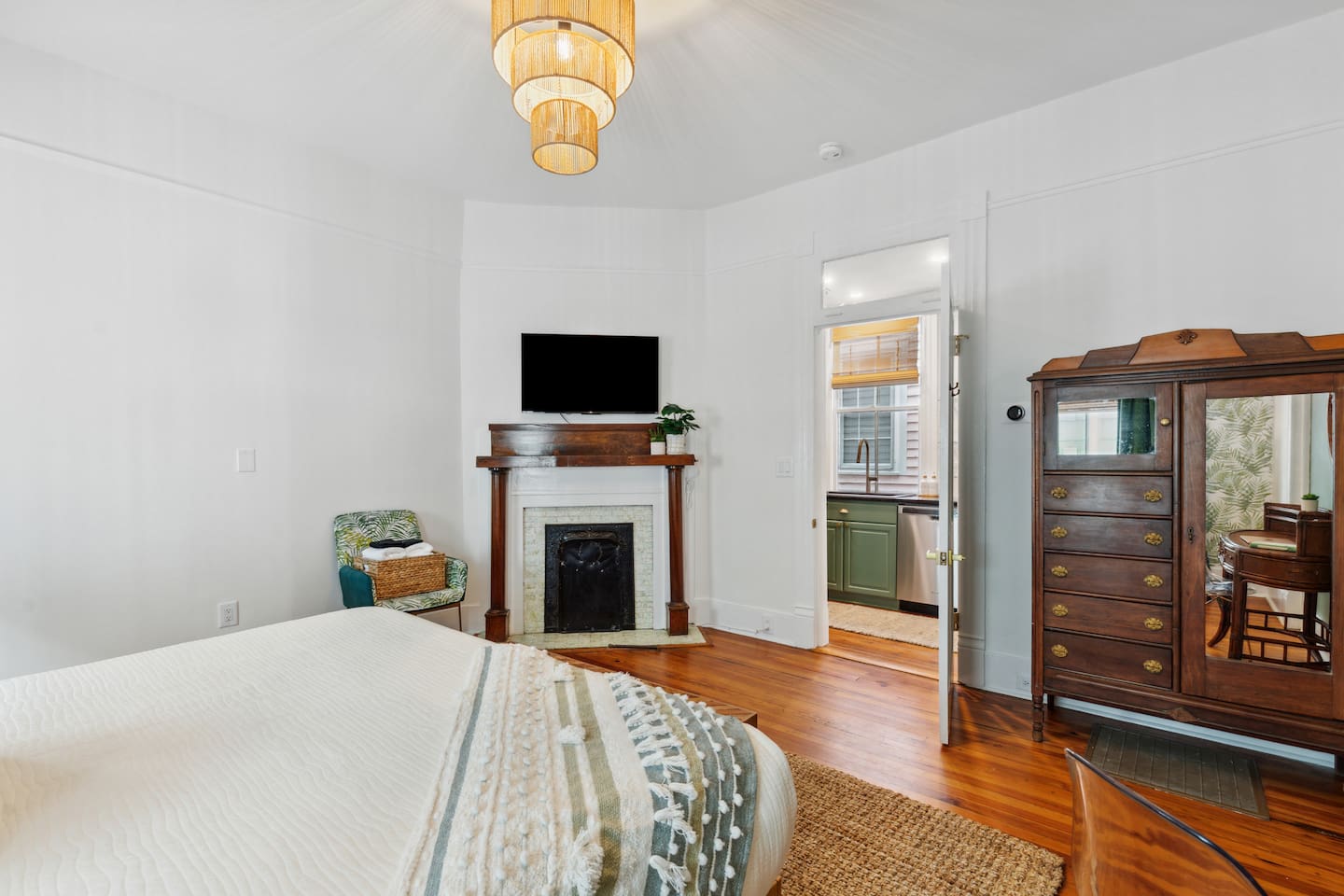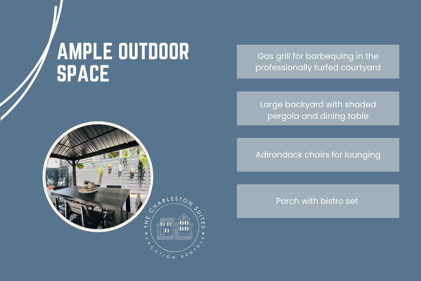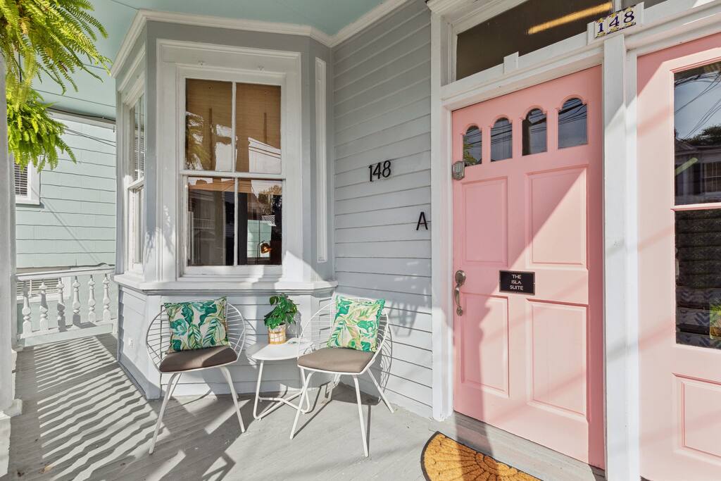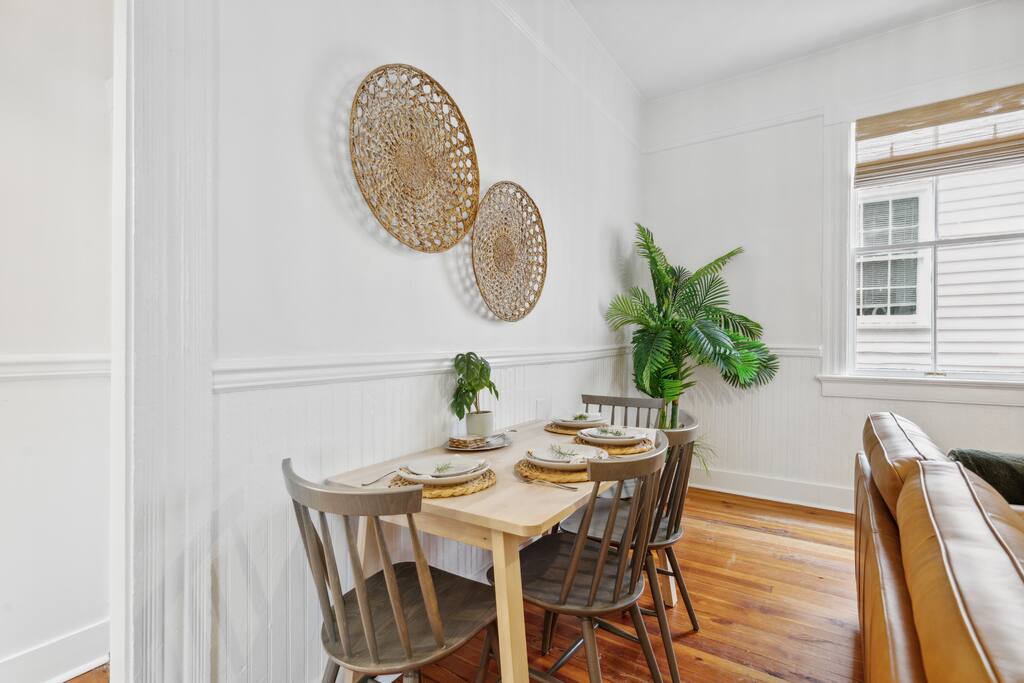Isla Suite: A Dream Getaway for Friends The Isla Suite is a vibrant first-floor retreat in beautiful Charleston, crafted for an unforgettable friends’ group getaway. Positioned just steps from downtown’s premier cocktail bars, top-rated restaurants, and boutique shopping, this property places your group at the heart of the city’s lively scene. Three pristine beaches, perfect for group outings, are only a 15-minute drive away. The outdoor areas are designed for group relaxation and fun. The inviting front porch is ideal for morning coffee or evening toasts, while the professionally turfed courtyard features a grill, pergola, dining table, and seating, creating a perfect backdrop for group barbecues or late-night chats. Step inside to a tropical, modern interior tailored for group enjoyment. The kitchen, painted a soothing muted green, is fully equipped with sleek appliances and ample counter space, great for preparing shared meals or mixing cocktails. Off the kitchen, the living room features a table that seats four, ideal for intimate breakfasts or small group game nights. While you’ll likely be out exploring all Charleston has to offer, the spacious living room, with its luxurious leather sofa, is a great place to relax in the morning or unwind with group conversations in the evening. The suite comfortably hosts up to eight friends across four thoughtfully designed bedrooms. The primary bedroom features a king bed and a cozy reading nook. The second king bedroom includes a desk for planning group adventures. The third bedroom offers a queen bed and additional workspace, while the fourth is a versatile bunk room. Each bedroom includes blackout curtains, small fans, and sound machines to ensure everyone wakes refreshed. Two well-appointed bathrooms streamline group routines. One features a separate vanity and shower, ideal for shared prep time. The other includes a dual vanity, shower-tub combination, and a premium bidet-equipped toilet for added luxury. An in-unit washer and dryer allow your group to pack light and stay fresh. The Isla Suite is the ultimate base for groups exploring Charleston’s historic charm, hitting downtown hotspots, or relaxing on nearby beaches. This dog-friendly property welcomes furry friends upon request. P.S. While tailored for friends’ getaways, The Isla Suite is also well-suited for romantic couples’ retreats or family vacations, with amenities including a Pack+Play, bamboo dishes, and a highchair available. **Book The Isla Suite for your dream getaway!** *Charleston Permit: OP2023-04503*