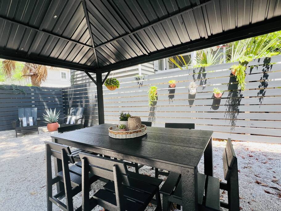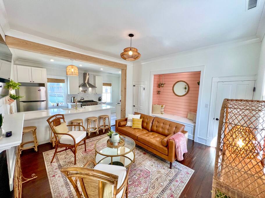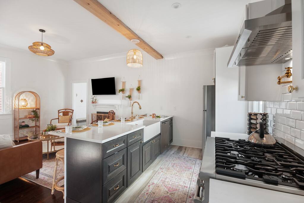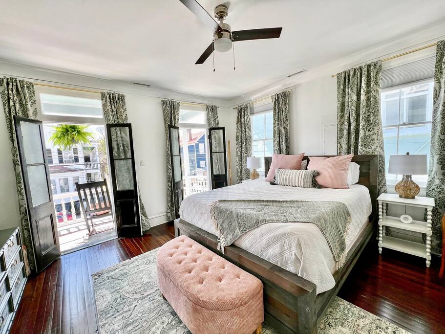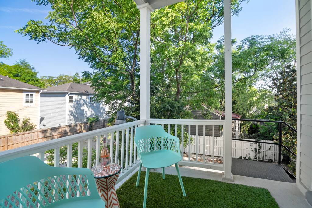 Here’s a more relaxed and inviting version of the description for **The Poppy Suite**: --- Welcome to The Poppy Suite! After a long day of exploring Charleston, it’s always nice to come back to a place that feels like home. That’s exactly what we’ve created with The Poppy Suite—a newly renovated top-floor getaway designed to help you recharge and unwind. With two private balconies, a courtyard featuring a bistro set and lounge chairs, and a spacious shared backyard with extra seating and a pergola, you’ll have plenty of outdoor spaces to enjoy the sunshine and fresh air. Walk up your private indoor staircase, and you’ll be welcomed by an open floor plan that’s both stylish and comfortable. The living room, dining area, and balcony blend together effortlessly, creating a great space for relaxing or gathering with loved ones. The warm shades of pinks and oranges throughout the room bring a little bit of Charleston’s sunset magic indoors. Whether you’re sinking into the sofa with a good book or enjoying snacks and drinks with friends, this is your spot to relax. We’ve even added a cozy bohemian reading nook if you need a little quiet retreat. The fully equipped kitchen is ready for whatever meals you’ve got in mind—from a quick breakfast to a gourmet dinner. Quartz countertops, a large island, a ZLine Chef Range, and a wine fridge make it easy to cook up something special. When it’s time to rest, you’ll find three cozy bedrooms designed with comfort in mind. The primary bedroom has a king-size bed and opens to a large balcony with rocking chairs and an outdoor loveseat, perfect for those peaceful mornings or evenings. The second bedroom has a queen-size bed and a desk for those who might need to catch up on work. The third bedroom, with its charming Serena and Lily wallpaper, features a twin-over-full bunk bed and access to the second balcony. All bedrooms come with blackout curtains and sound machines, so you can enjoy a peaceful night's sleep. The bathroom is a treat, too, with a rain shower and built-in bench. We’ve got you covered with towels, shampoo, conditioner, body soap, and a clothing steamer. Outside, you’ll find two great spots to enjoy the Charleston weather. The professionally turfed courtyard is perfect for a sunny morning coffee or an afternoon barbecue, with Adirondack chairs that invite you to sit back and relax. In the shared backyard, there’s a pergola, more seating, and a full dining table for six—ideal for outdoor meals or unwinding in the shade. At The Poppy Suite, we want you to feel at home while you experience the charm of Charleston. Book your stay today and get ready to relax, explore, and enjoy all the comfort and style we have to offer. City of Charleston Certificate of Operation: OP2024-05118