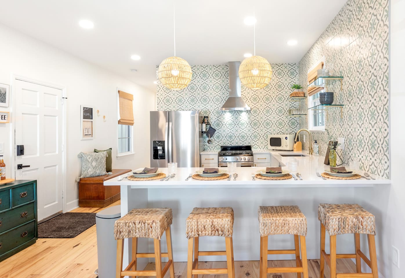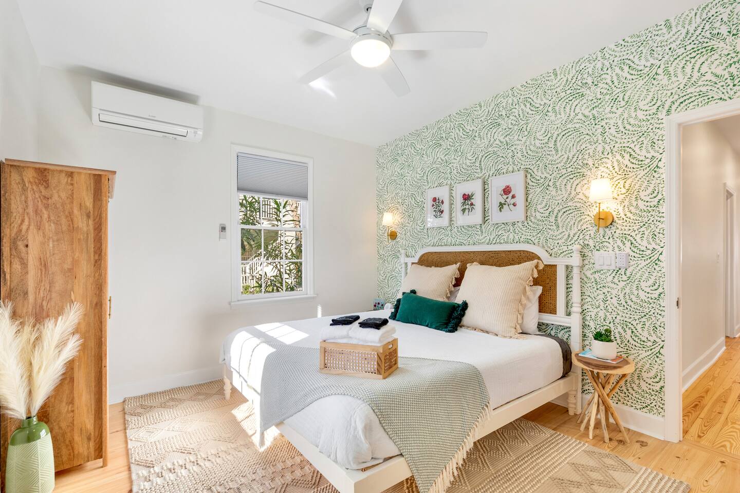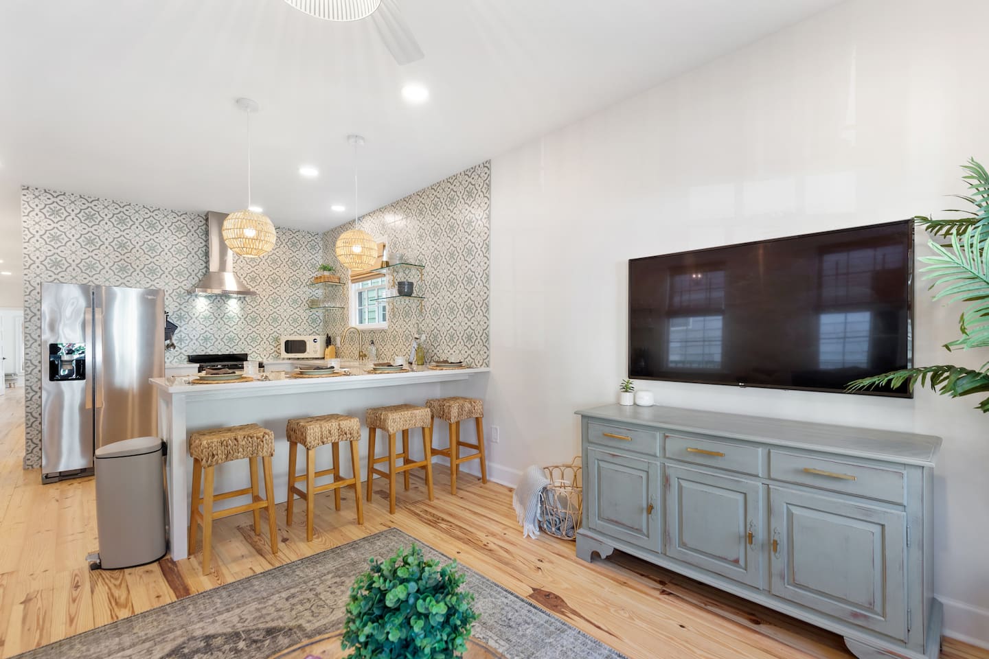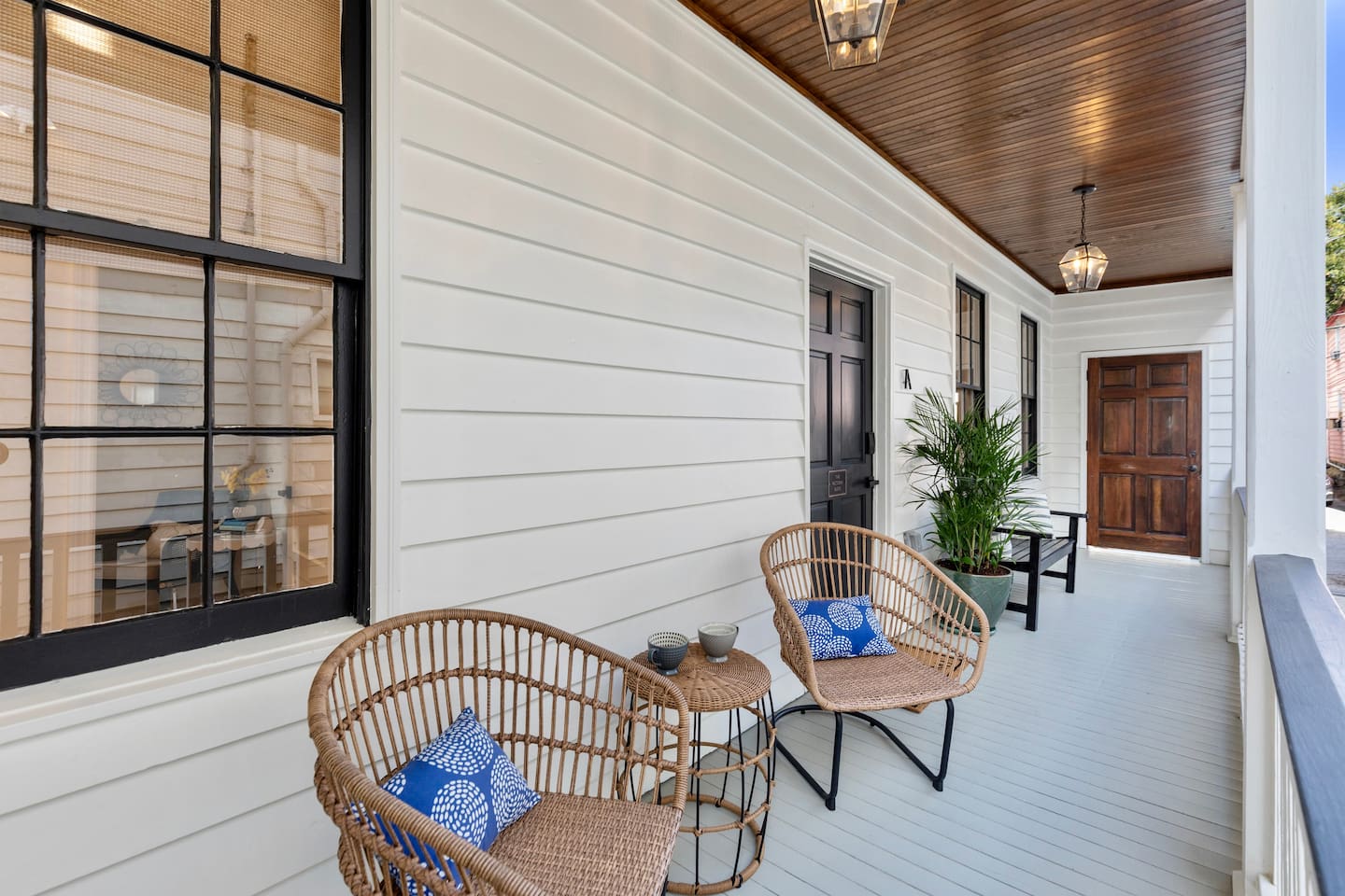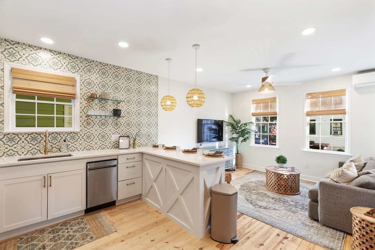 Welcome to The Victoria Suite, where Southern charm and hospitality meet comfort. As you approach the building, you’ll be drawn in by its grand white exterior and classic dual balconies, a nod to Charleston’s signature architecture. Step through the front door, featuring a charming coastal crab knocker, and onto your private first-floor piazza. The deep mahogany wood-paneled ceilings and hanging lantern lights create a peaceful and welcoming atmosphere. Inside your private first-floor unit, you'll be greeted by warm natural light, a vibrant green ceramic backsplash in the kitchen, a spacious living room, and stunning heart pine floors throughout. The kitchen is fully equipped with stainless-steel appliances, quartz countertops, and all the essentials for cooking at home. A small coffee bar, complete with a 12-cup coffee pot, coffee, and flavored syrup, will help start your mornings right. Relax in the living room on the cozy Crate and Barrel sofa, or kick back in the sleek side chairs while catching up on your favorite shows with the smart TV. The cool gray and green tones create a soothing atmosphere, while woven window treatments balance privacy and sunlight. The Victoria Suite features three thoughtfully designed bedrooms, each equipped with blackout blinds and sound machines for a restful night’s sleep. The first bedroom has a king-size bed with whimsical green Serena and Lily wallpaper, along with a full armoire and nightstands with reading lamps. The second bedroom offers a queen-size bed, tropical pink pineapple wallpaper, a desk, and ample clothing storage with a closet and dresser. The third bedroom also has a queen-size bed, complemented by tropical wallpaper, a comfortable reading chair, and plenty of clothing storage. There are two bathrooms, both beautifully appointed. The first includes a rain shower, dual vanity, and a bidet-equipped toilet, while the ensuite bathroom off the primary bedroom features a convenient stand-up shower. Plush towels, hairdryer, clothing iron, and essential toiletries are provided for your convenience. Outside, the shared backyard is a peaceful retreat. It features a pergola with bench seating, a chair swing, and poufs, perfect for gathering with friends or relaxing after a day of exploring. Fire up the grill for a barbecue, or lounge in one of the Adirondack chairs. There’s also a large JENGA set to keep the fun going. Additional amenities include high-speed Wi-Fi, air conditioning, heating, children’s toys and books, and free parking for one vehicle. Families will also find a pack + play, highchair, and beach accessories for added convenience. The Victoria Suite strikes the perfect balance between relaxation and access to everything Charleston has to offer. Within walking distance, you’ll find cocktail bars, restaurants, and boutique shops that showcase the city’s vibrant local scene. And when it’s time to hit the beach, three stunning options are just a 15-minute drive away. Whether you’re looking for adventure or some well-deserved rest, The Victoria Suite offers everything you need for a memorable Charleston getaway. City of Charleston Certificate of Operation: OP2023-04269
